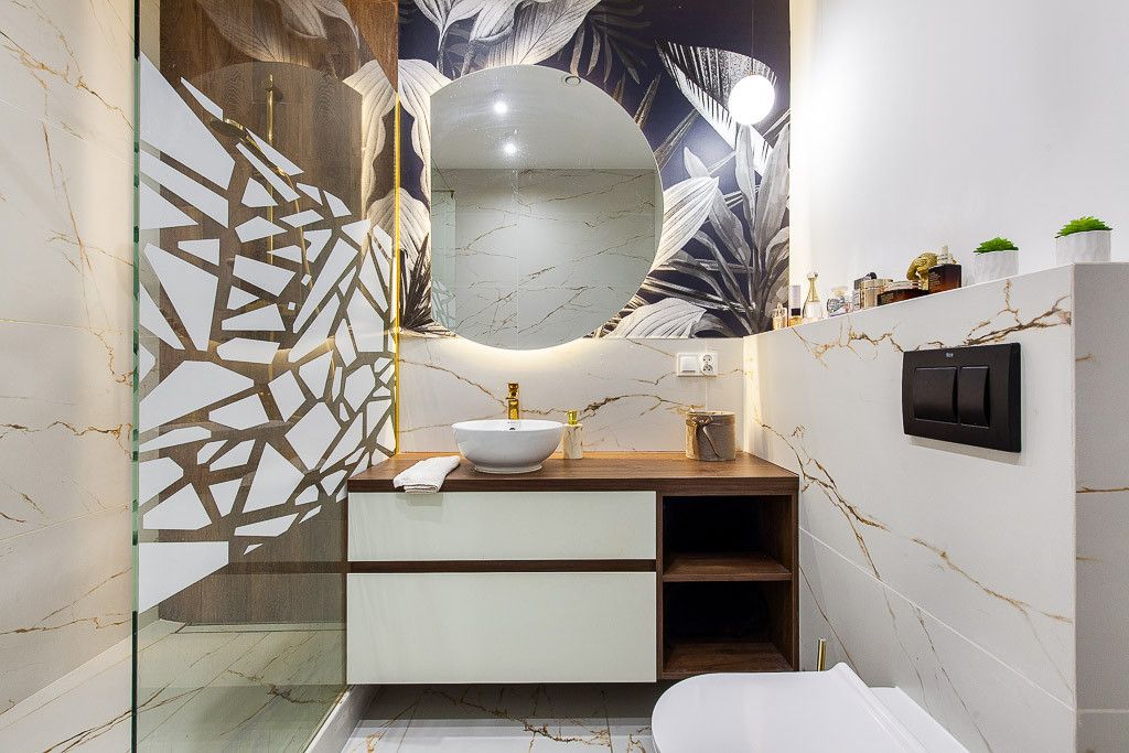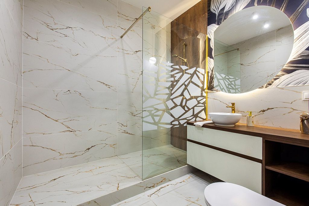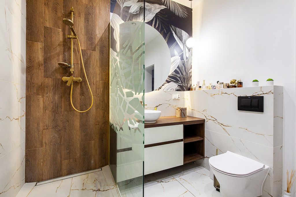 Stylowa łazienka utrzymana w tonacji marmuru i złotych dodatków oferuje przestronny prysznic z odpływem liniowym, umywalkę nablatową, szafkę oraz WC. Stonowane oświetlenie i eleganckie wykończenie tworzą atmosferę domowego spa.