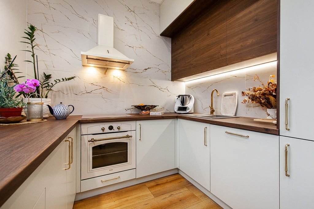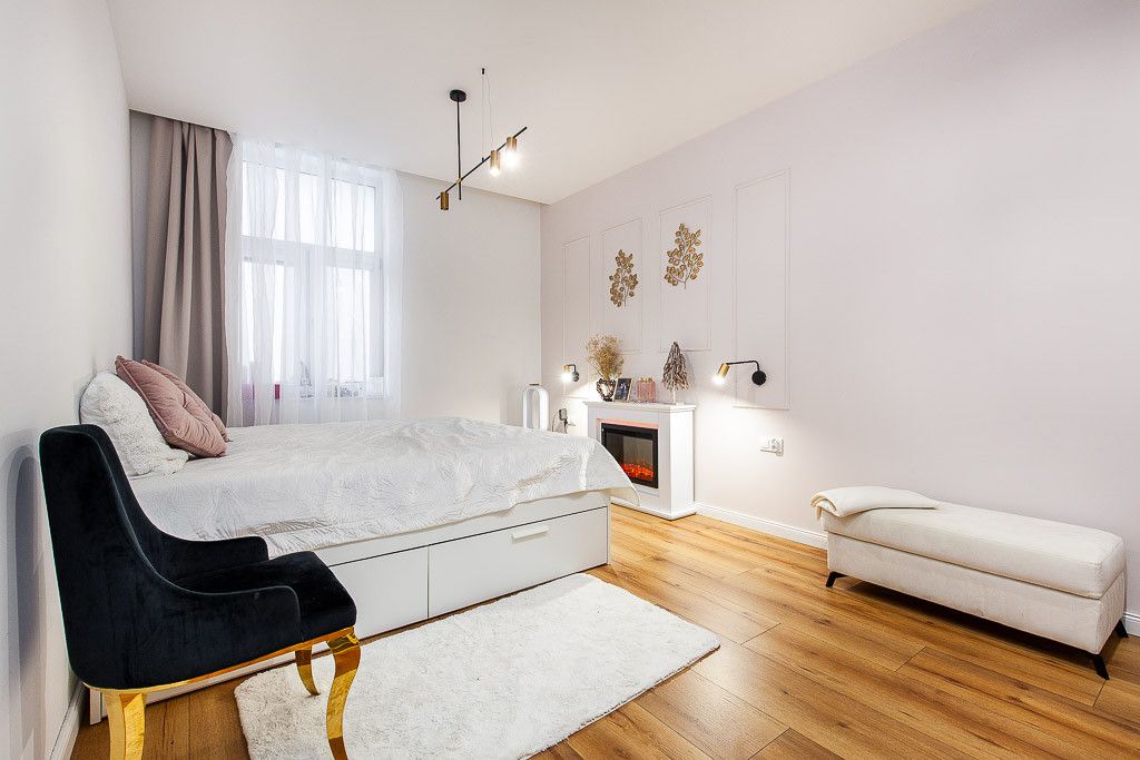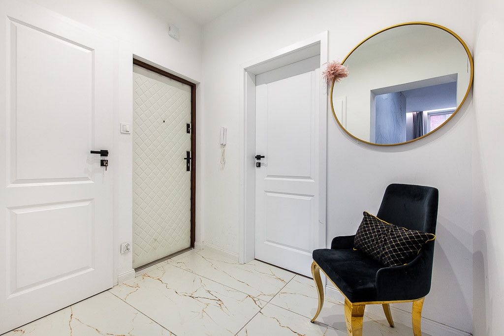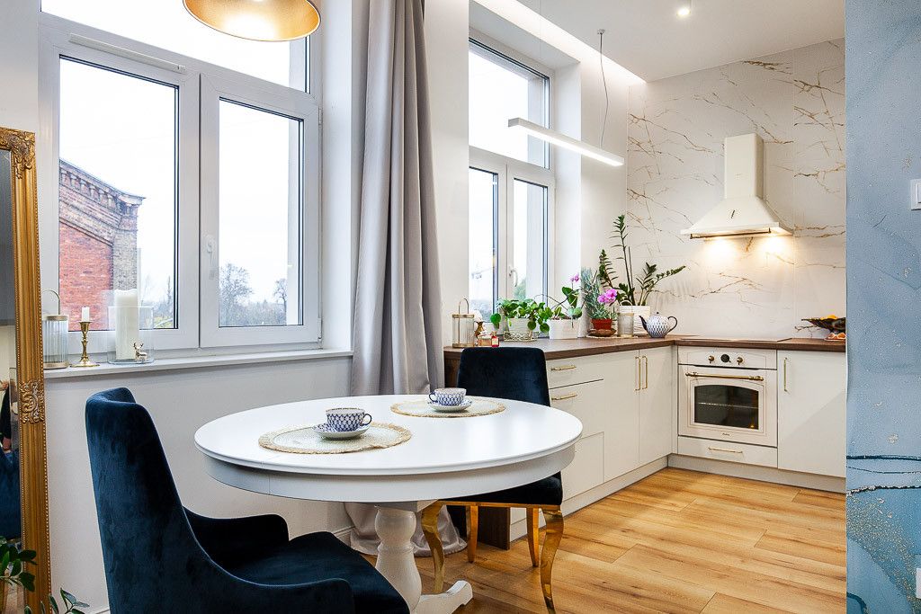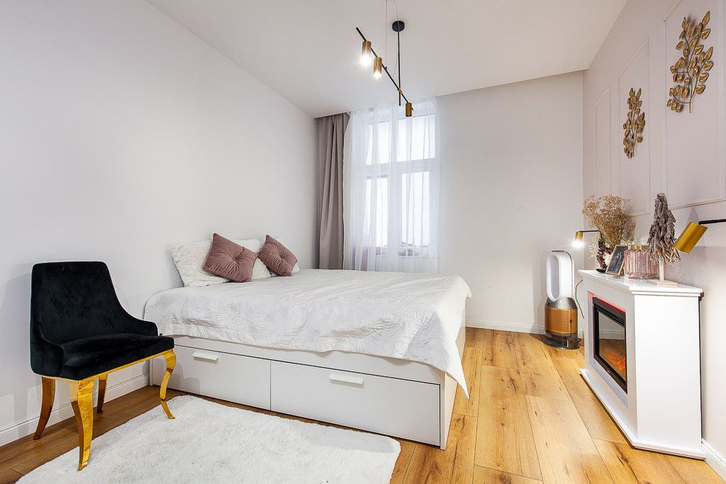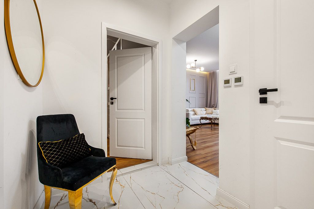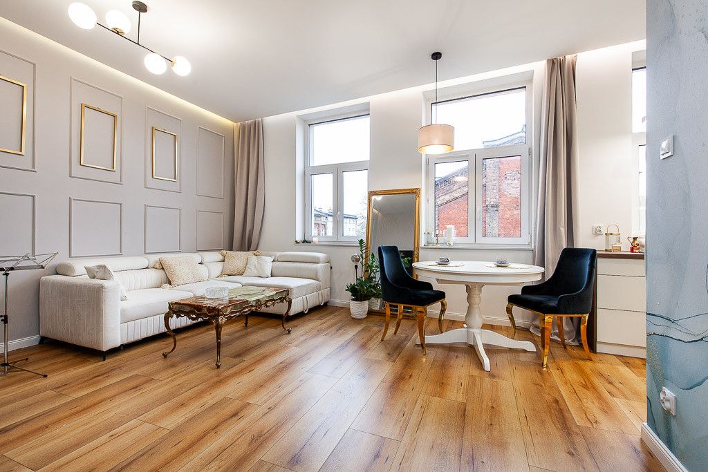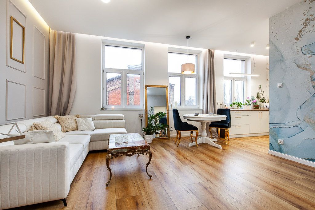 Przestronne mieszkanie o powierzchni 61,48 m² zostało urządzone w eleganckim stylu glamour, z dużą dbałością o detale. Centralnym punktem jest imponujący salon z aneksem kuchennym - ponad 30 m² otwartej przestrzeni z wysokimi, ponadtrzymetrowymi sufitami, dekoracyjną sztukaterią i artystycznie wykończoną ścianą, która dodaje wnętrzu wyjątkowego charakteru.