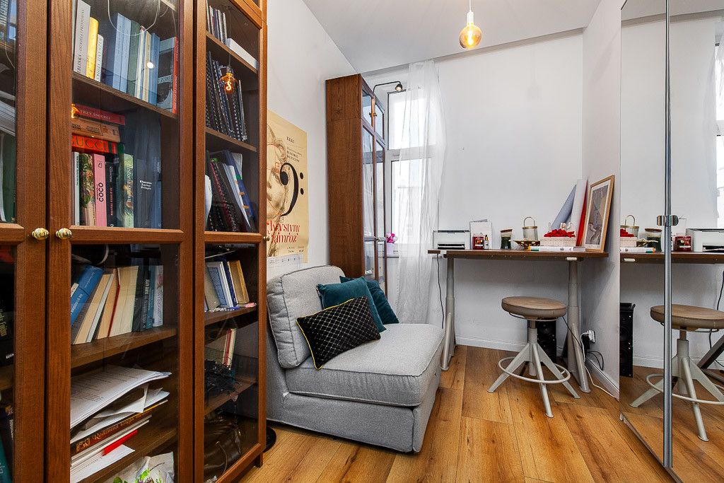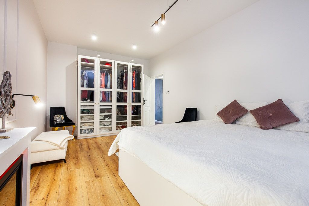 Główna sypialnia (ok. 20 m²) zapewnia prywatność i przytulny klimat, natomiast drugi pokój świetnie sprawdzi się jako biuro lub pokój gościnny.