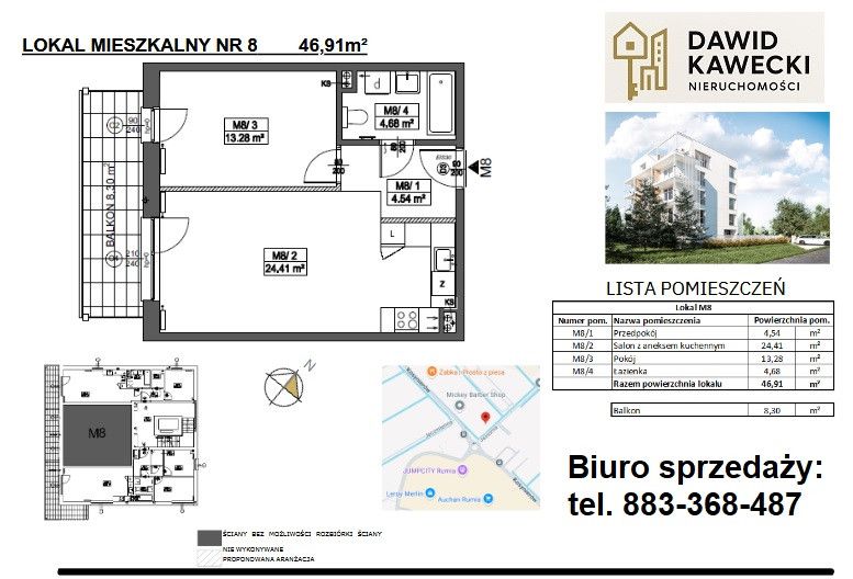 Nieruchomość o powierzchni 46,91 m² z znajduje się na drugim piętrze budynku i składa się z: