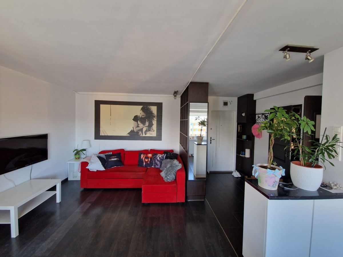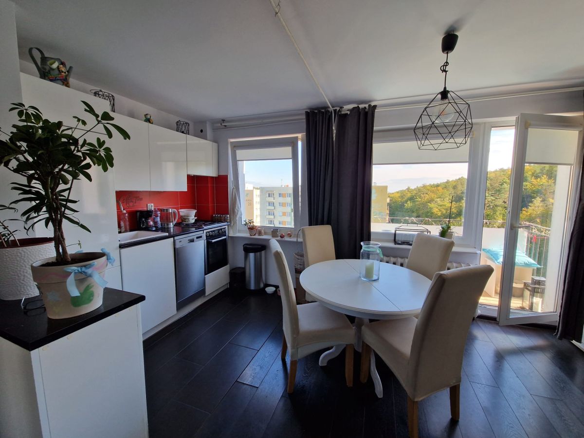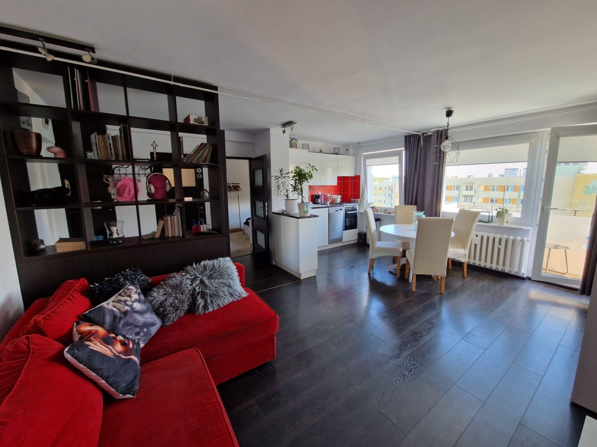 - słoneczny salon z aneksem kuchennym i wyjściem na balkon,