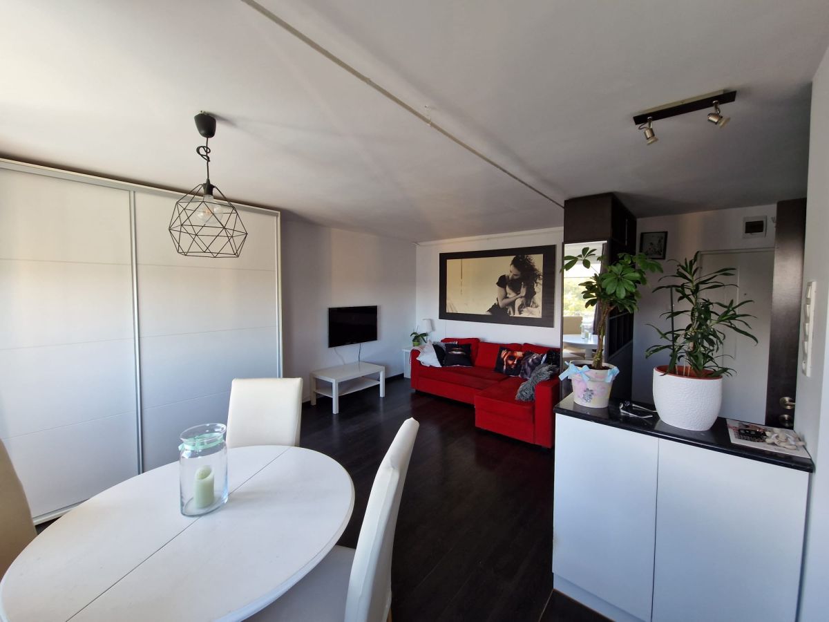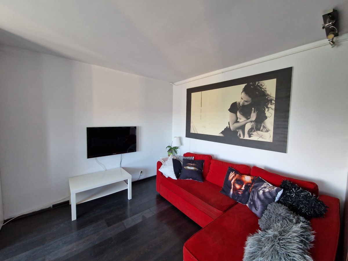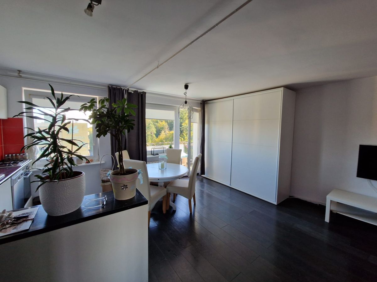 - słoneczny salon z aneksem kuchennym i wyjściem na balkon,